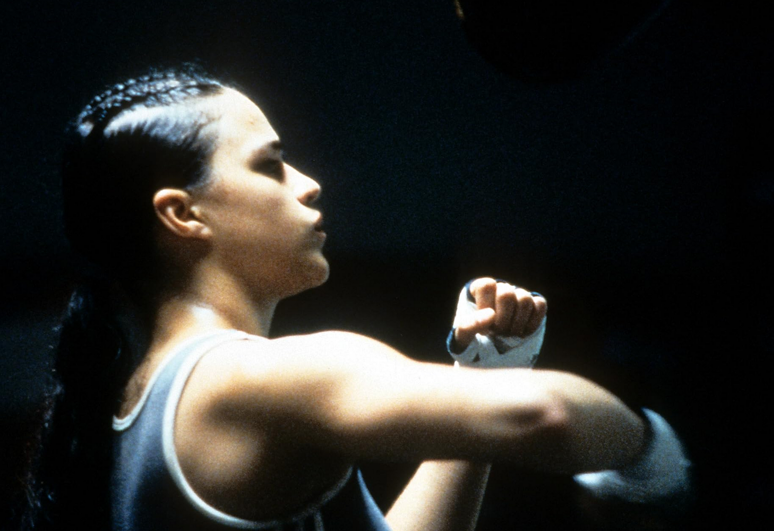 Kusama refuse toute mythologie du sport. Aucun ralenti glorieux, aucune musique qui gonfle artificiellement l’émotion. Diana a son vestiaire dans un placard à balais. Résistance. On doit souffrir avant d’éclore. Dans la salle de boxe, la phrase affichée agit comme un manifeste: « You don’t fight to win. You fight not to lose. » (On ne se bat pas pour gagner. On se bat pour ne pas perdre). Cette phrase gouverne tout le film. L’esthétique elle-même est une esthétique de la non-défaite. Il ne s’agit pas d’être beau, ni même fort. Il s’agit de tenir. Regarder « Girlfight », c’est accepter d’être maintenu dans un inconfort constant. Et puis, il y a Michelle Rodriguez…